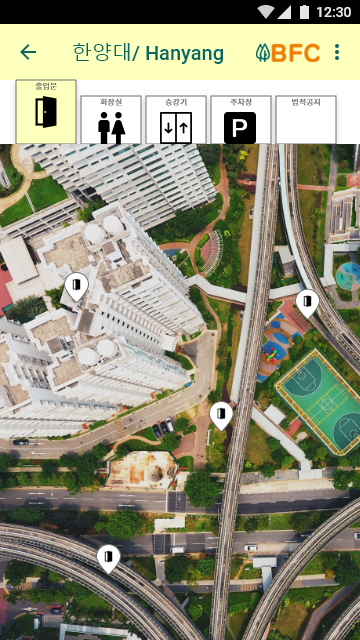 2/ to elevate web response speed by using lower image resolution and minimizing the page layers. The user may be in a situation to require prompt information as the categories were Entrance, Toilet, Lift, Parking lot. The aerial-photographed maps Angelswing Inc. provided were downsized and the maps were united to eliminate backspace interaction.